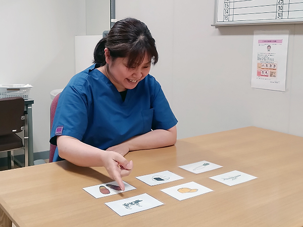 また、摂食嚥下機能を評価し、安全に食事摂取ができるように食事形態を決めたり、摂食嚥下機能を高めて、少しでも食べたいものが食べられるように援助していきます。