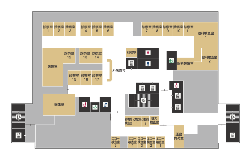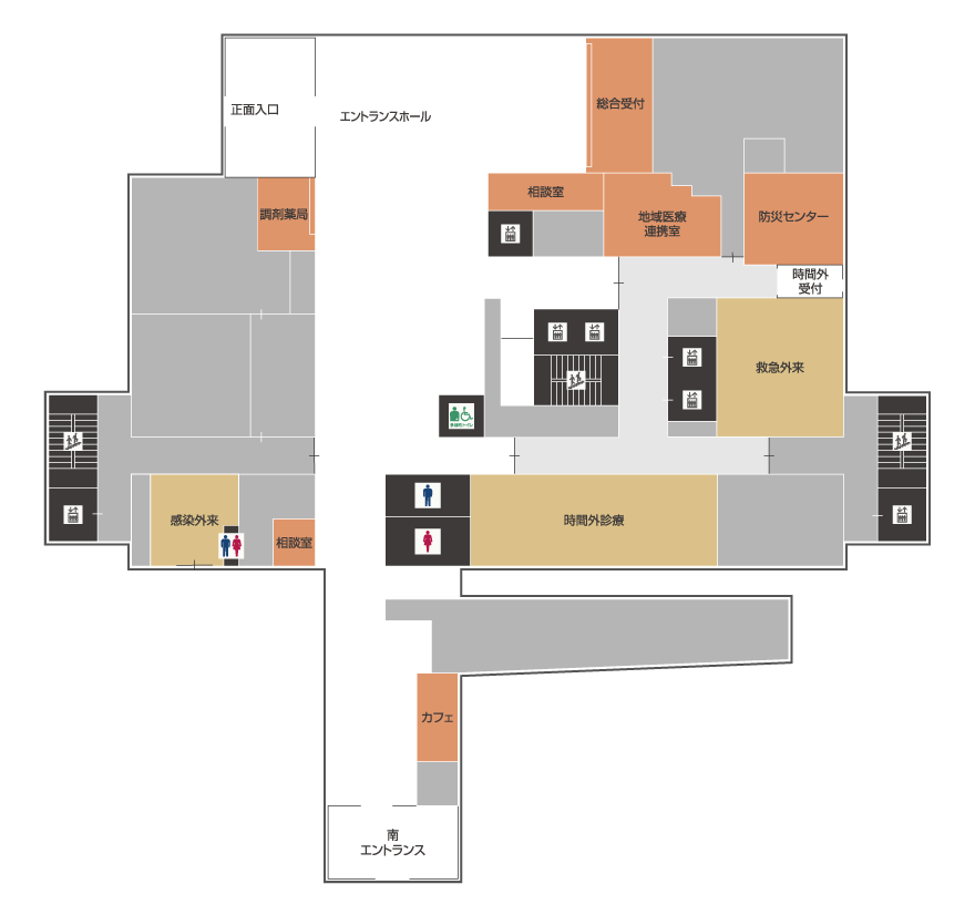 総合受付/救急外来/時間外診療/感染外来/薬局/地域医療連携室/カフェ